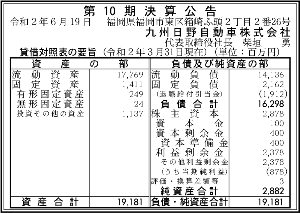 九州日野自動車株式会社 第10期決算公告 官報決算データベース